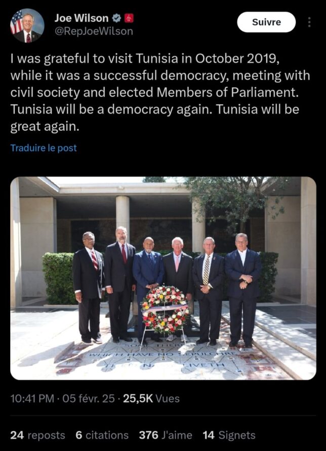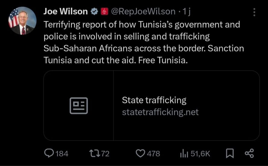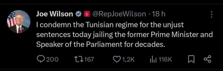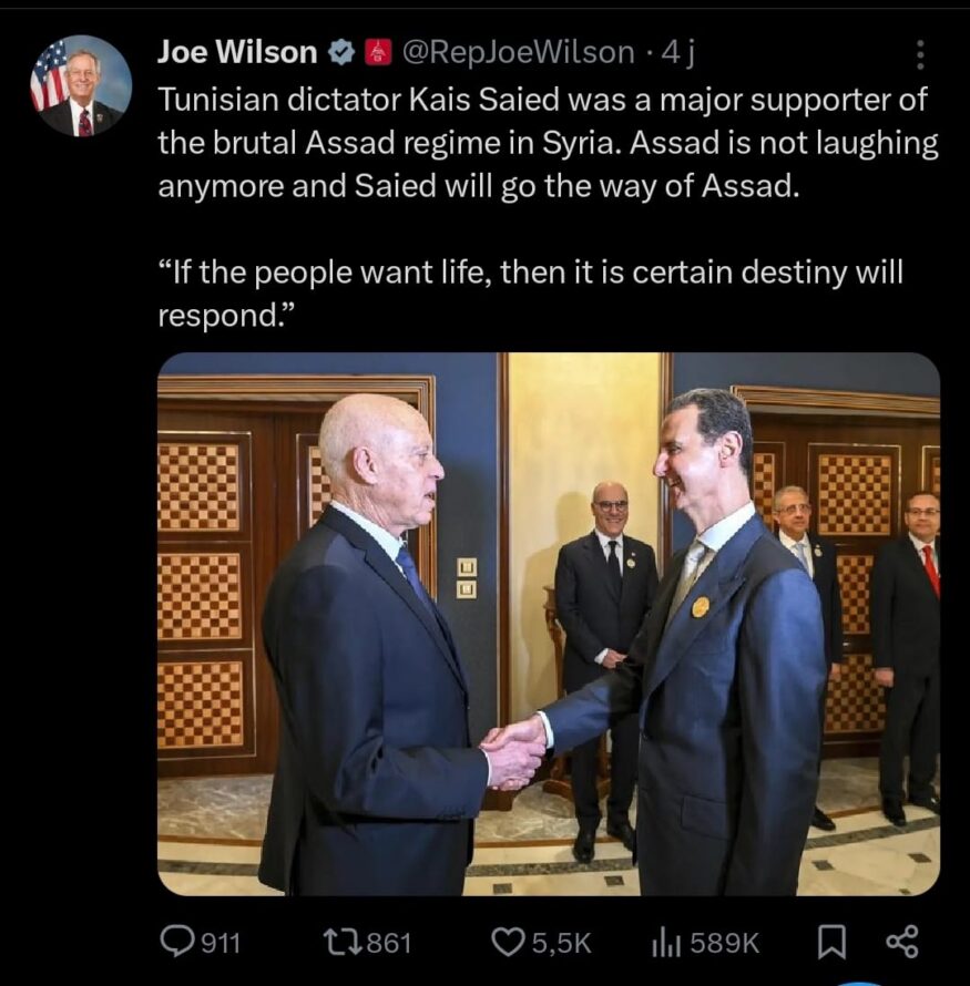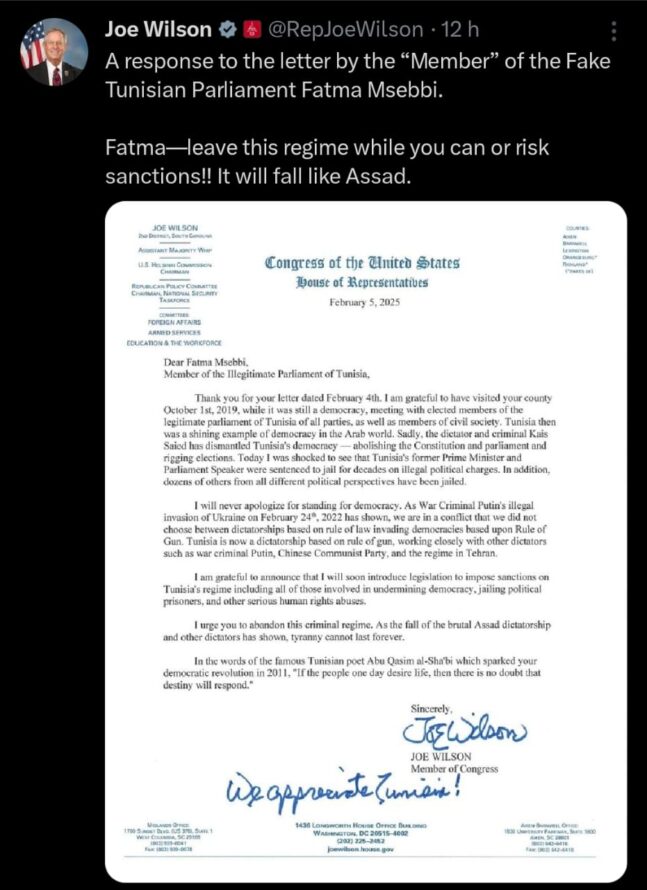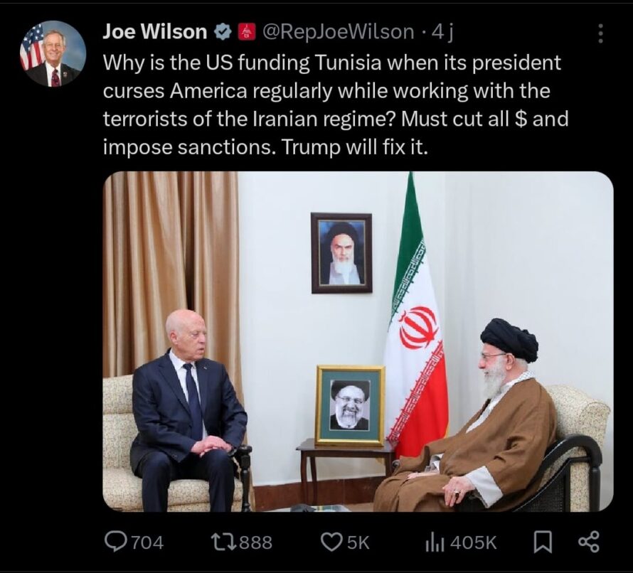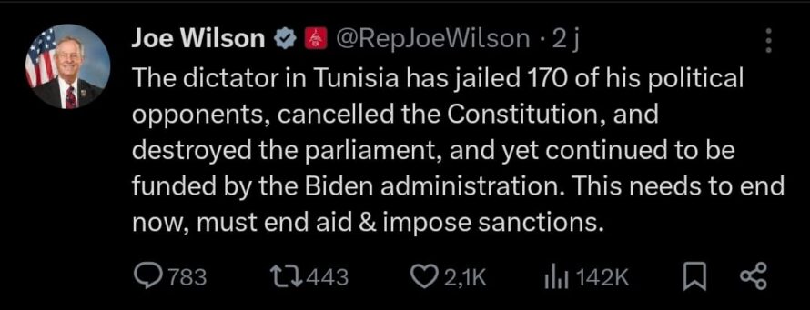 نشر النائب الجمهوري في مجلس النواب الأمريكي، جو ويلسون، في الأيام الأخيرة عدة منشورات على منصة X فاقت العشرة موضوعها تونس. ودعا ويلسون في البداية إلى قطع المساعدات عن تونس، على خلفية ما وصفها بسياسات ومواقف الرئيس قيس سعيّد ”الديكتاتورية والمناهضة للولايات المتحدة’ وفق تدوينته’.
